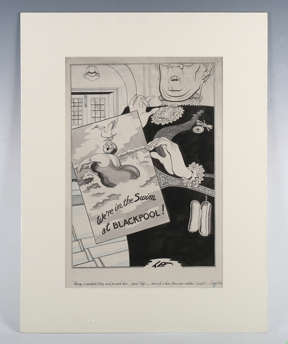 Joseph Lee (British 1901-1974) - ‘We’re in the Swim at Blackpool!’; ‘Air Raid Damage Repairs Dept’; ‘Prize Marrow, Ministry of Agriculture and Fisheries’; ’Stonehenge… sunrise, midsummer morning...’, four original cartoons, pen, ink and wash all signed, the largest 48.5cm x 34cm, unframed (4).