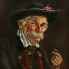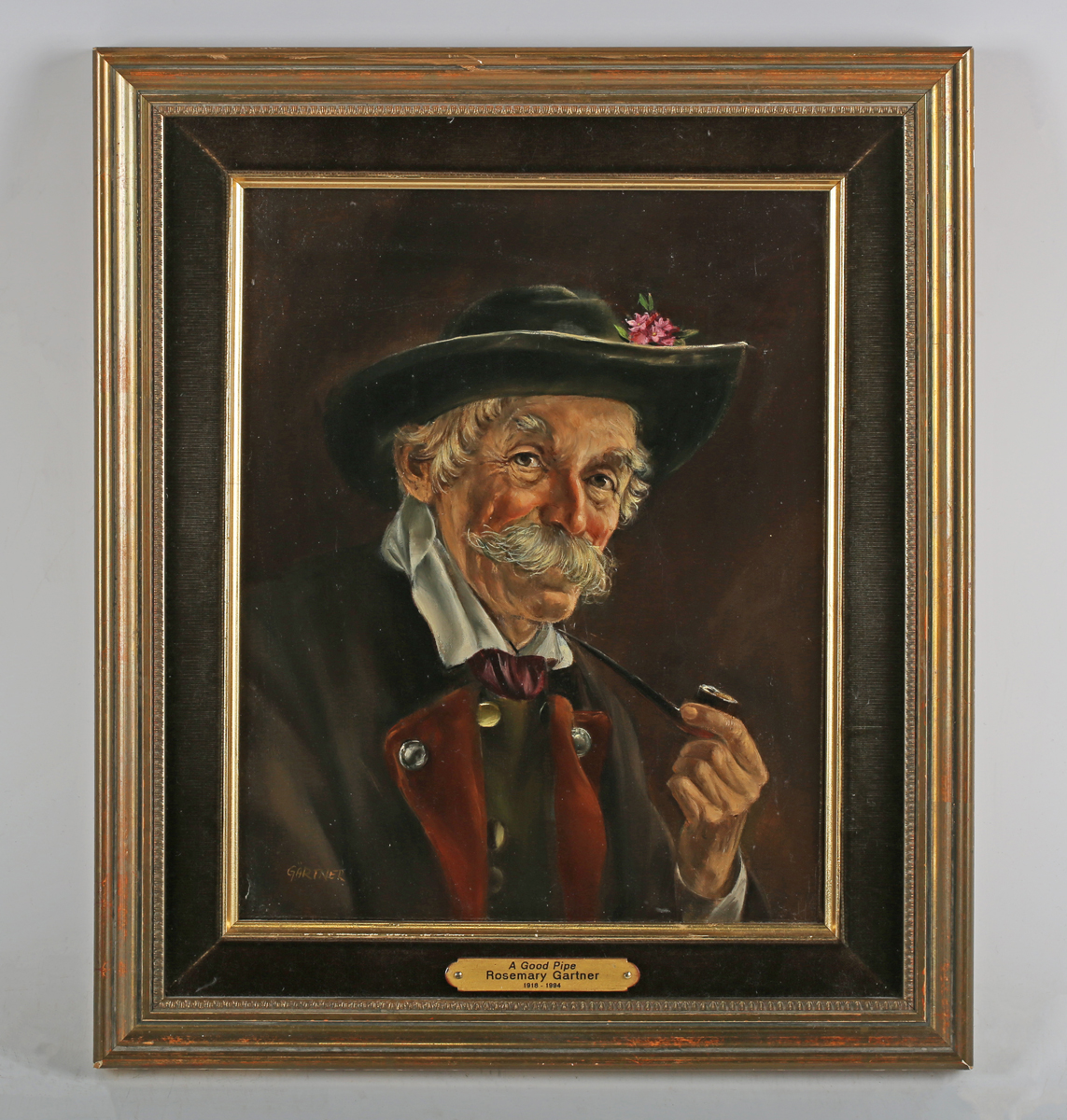 Rosemary Gartner (1918-1984) - ‘A Good Pipe’, oil on canvas, signed lower left, 25cm x 20cm, within a gilt and velour frame.