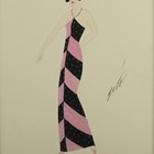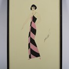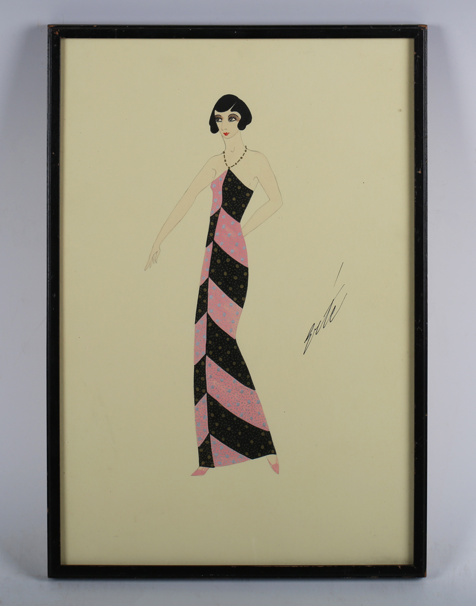 Attributed to Erté (Romain de Tirtoff, Russian/French 1892-1990) - Elegant lady in geometric pink and black dress, pen, ink and gouache, heightened with gold and silver pen, signed middle right, 36cm x 24cm, within a back frame.