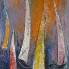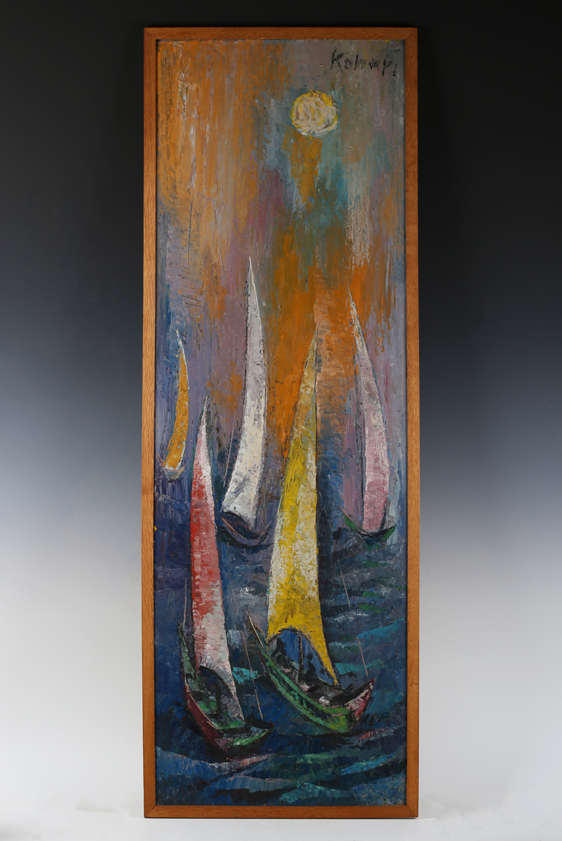 Masood Kohari (Pakistani b.1939) - Sailing board, oil on board, signed upper right, 121.5cm x 39.5cm, within a plain oak frame.