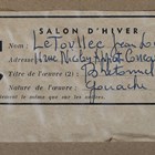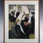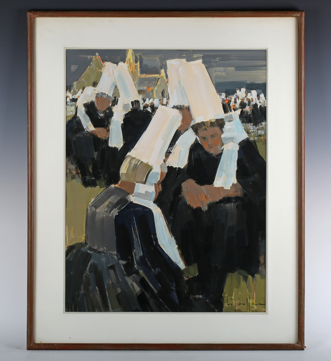 Jean-Louis Le Toullec (French 1908-1999) - ‘Bretomel’: group of figures in tall hats, gouache, signed lower right, inscribed on label verso, 63cm x 48cm, within a stained wood frame.