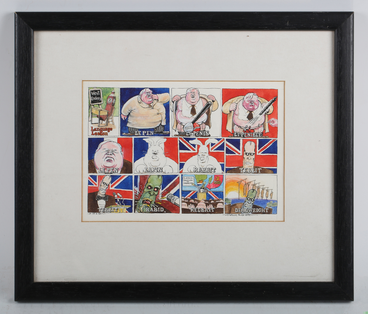 Steve Bell (British b.1951) - ‘West Enders Language Lesson’, watercolour cartoon, signed and dated 1988 lower right, 15cm x 21cm, within a black frame. Provenance: from the estate of the late Raymond Briggs, the world-renowned author and illustrator of The Snowman, Father Christmas and Fungus The Bogeyman.