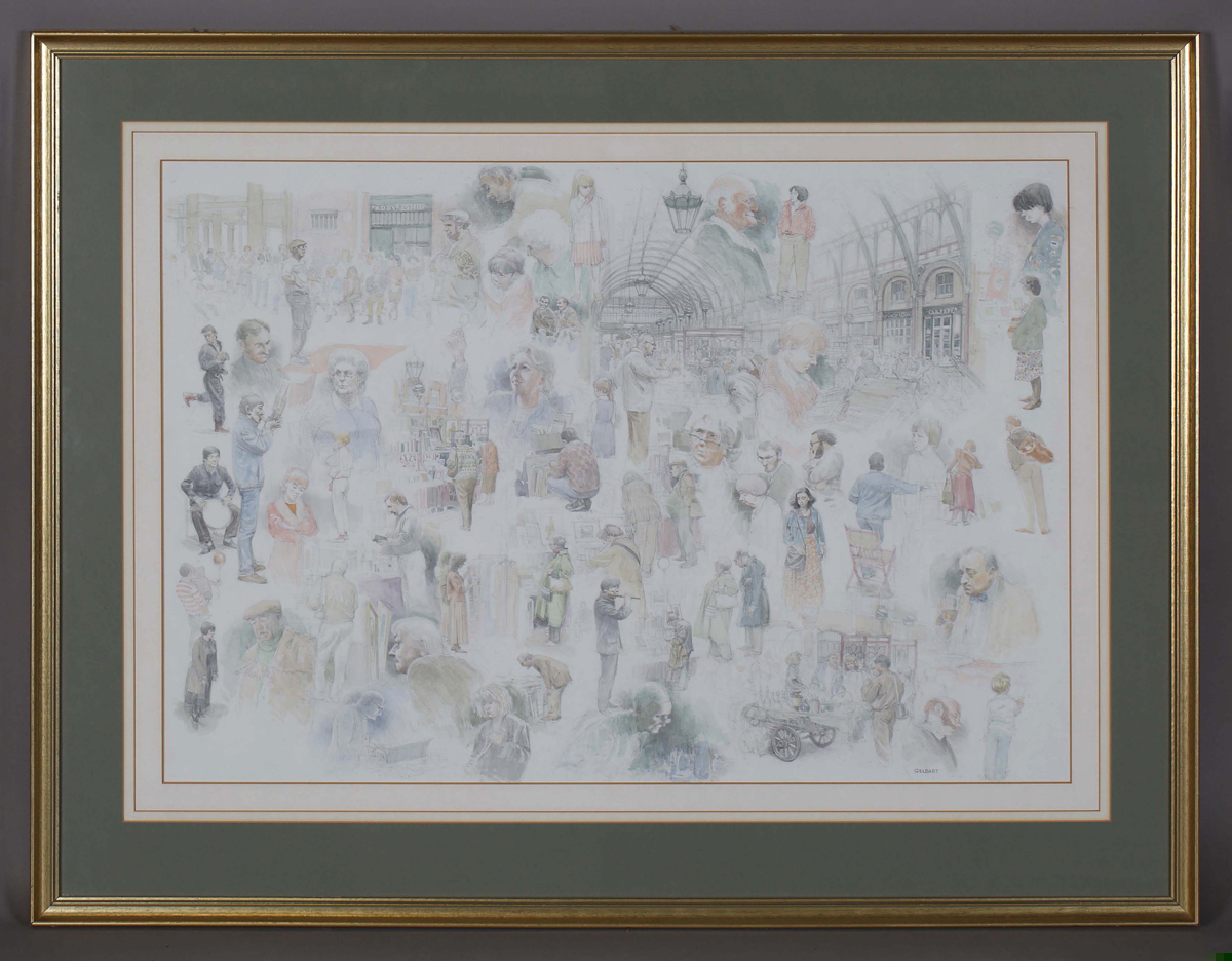 William Geldart (British b.1936) - Faces of Covent Garden, watercolour over pencil, signed lower right, 56cm x 81cm, within a gilt frame.