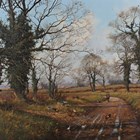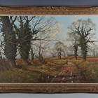 James Wright (British 1935-2018) - Winter landscape with figure, dog and poultry, oil on canvas, signed lower right, 51cm x 76cm, within a swept gilt composition frame.