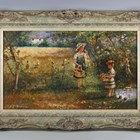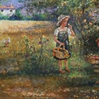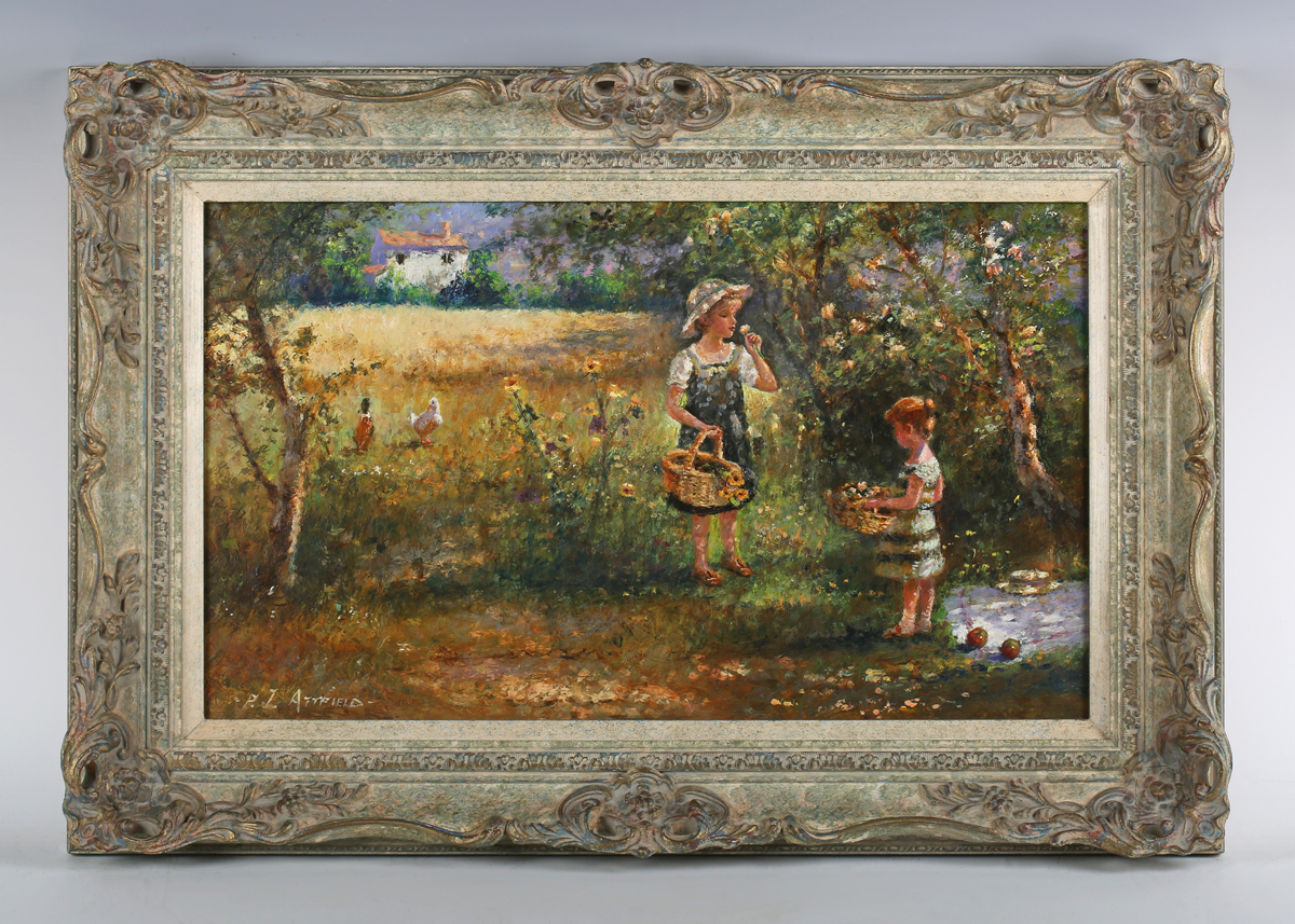 Paul J. Attfield (British b.1950) - ‘Girl with Basket’: children gathering flowers, oil on board, signed lower left, 30cm x 50cm, within a swept painted frame.