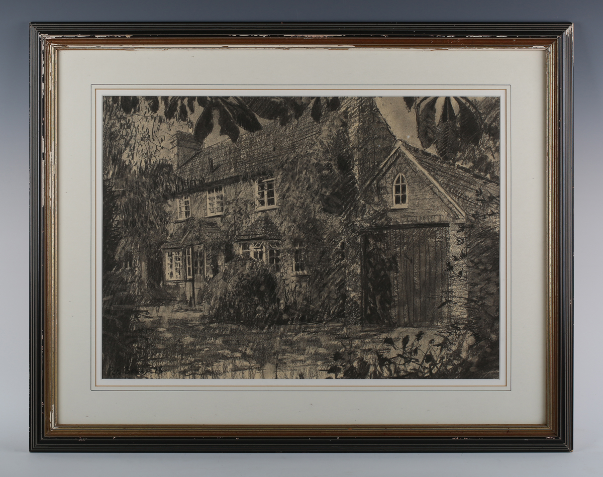 Peter Brown (British b.1967) - Country cottage, charcoal, signed and dated ’98 lower left, 39cm x 55cm, within a fluted black and gilt frame.