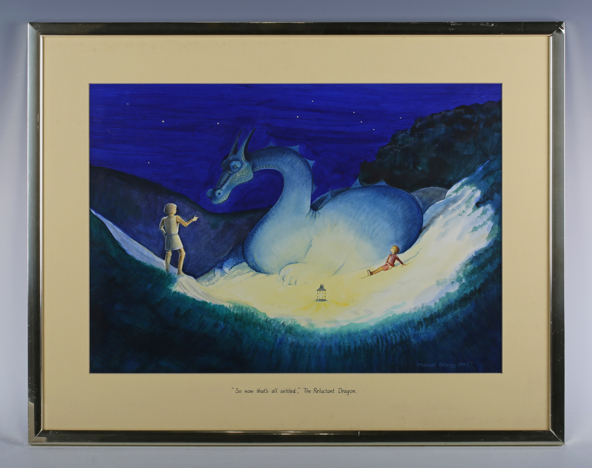"Michael Bragg (British late 20th century) - ‘""So now that’s all settled,"" The Reluctant Dragon’; ‘""But this would be a beautiful place for a fight -"" The Reluctant Dragon’, a pair, watercolour illustrations, both signed and dated 1987 lower right, each 356cm x 50.5cm, both within yellow metal frames (2)."