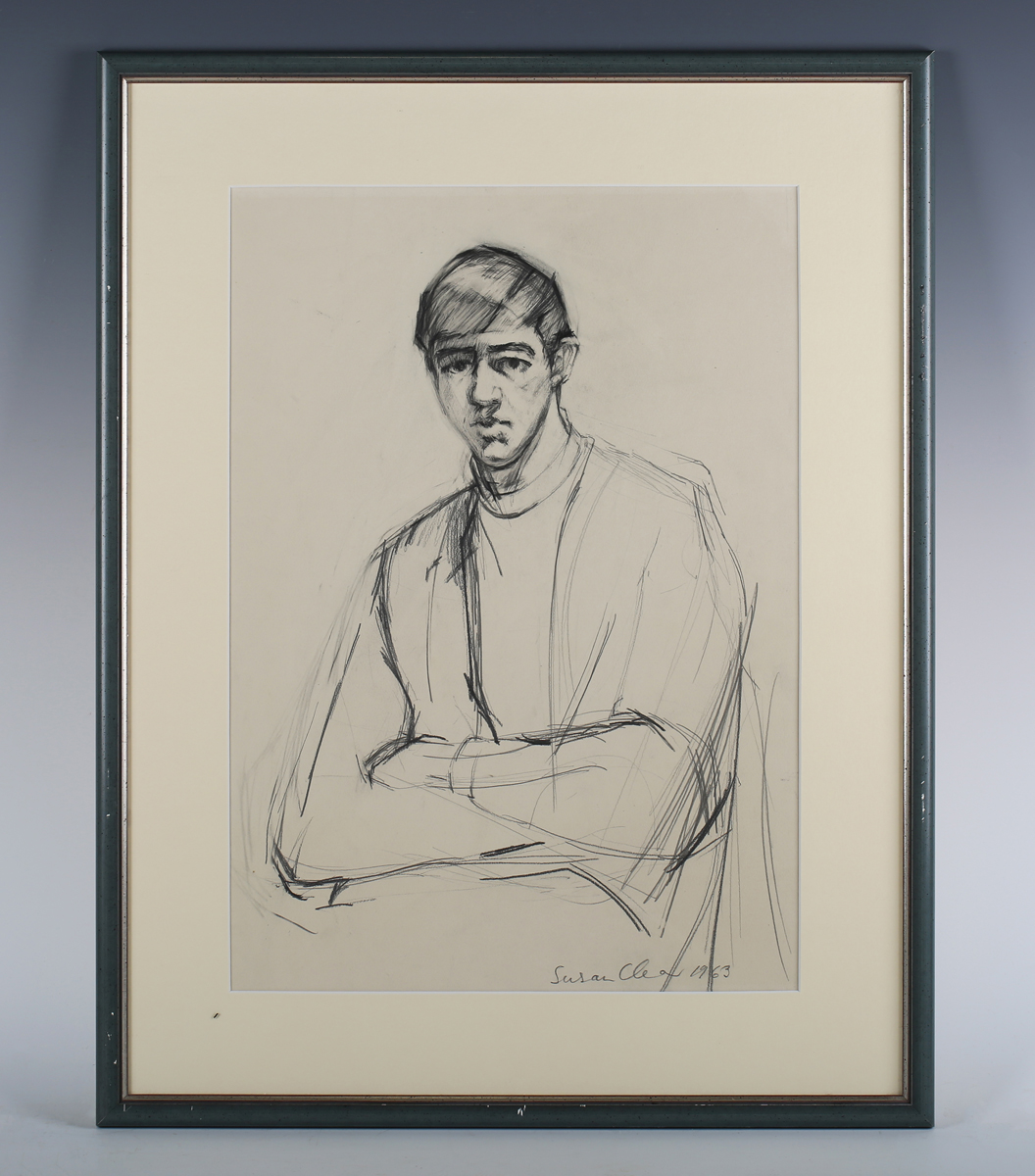 Susan Clear (20th century) - Portrait study of a young man, charcoal; Portrait study of a man, pencil, both signed lower right, the first dated 1963 lower right, the second dated 1965 lower right, the larger 47cm x 33cm, both within green painted frames (2).