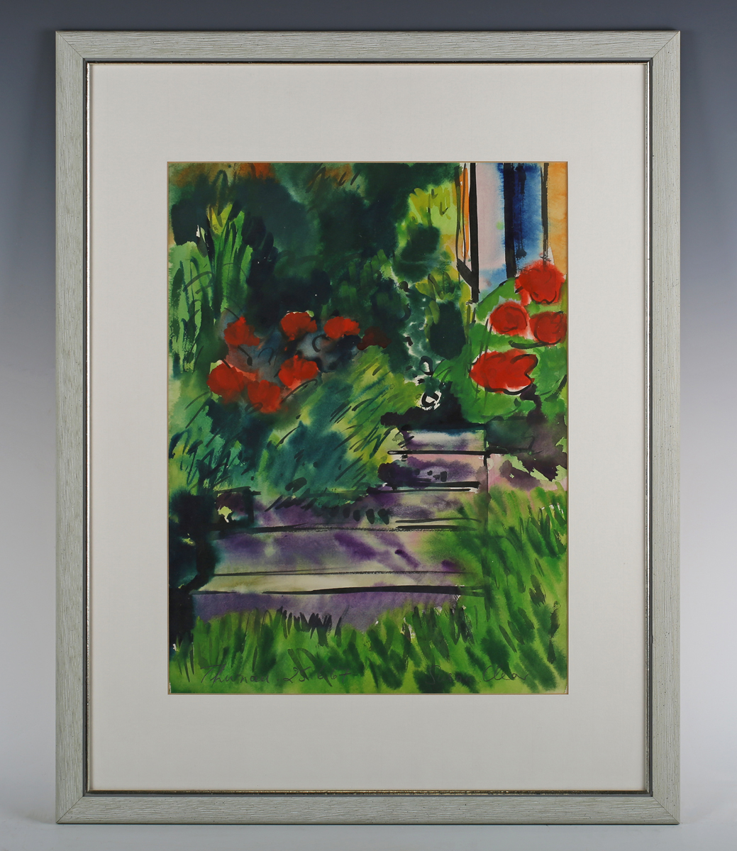 Susan Clear (20th century) - 'Thurnall'; 'Pacengo', two garden scenes, watercolour, both signed lower right and inscribed and dated 25.6.67 and 10.9.66 respectively lower left, each 46.5cm x 34.5cm, both within grey painted frames (2).