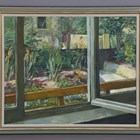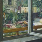 British School (late 20th century) - View of a garden from an open window, oil on board, 74cm x 90cm, within a gilt and painted composition frame.