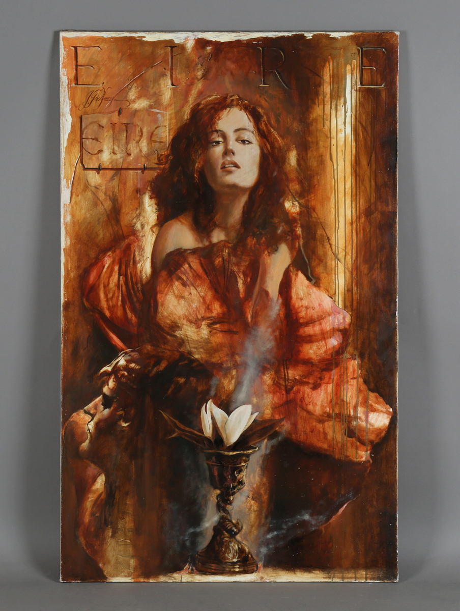 Yarek Godfrey (Polish 1957-2014) - ‘Eire’: study of a young woman with chalice and stone bust, oil on canvas, 146cm x 89cm, unframed. Provenance: CFM Gallery, Greene Street, New York.