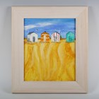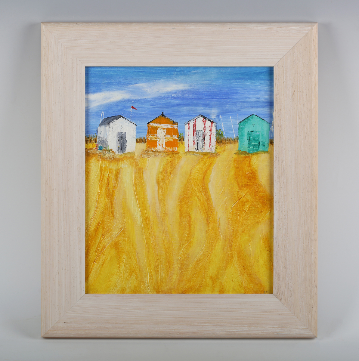 Brenda Brooks (British b.1932) - 'Southwold 2': beach huts and sand, oil on board, signed with initials lower right, titled verso, 29cm x 23.5cm, within a painted frame.