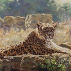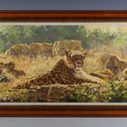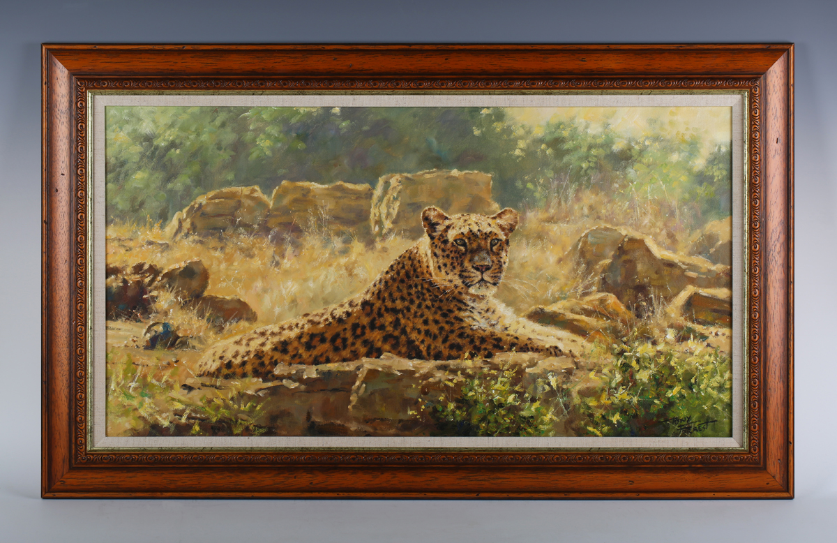 Tony Forrest (British b.1961) - Leopard in the sun, oil on canvas, signed lower right, 41cm x 76cm, within a stained wood frame.