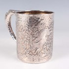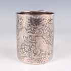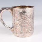 A Tiffany & Co sterling silver cylindrical christening tankard, engraved with playful rabbits amongst flowers against a hammered ground, flanked by a hammered scroll handle, detailed 'Tiffany & Co Sterling-Silver' and numbered '5280 M 3970' above '1868' to base, weight 170.6g, height 8.5cm.