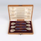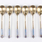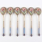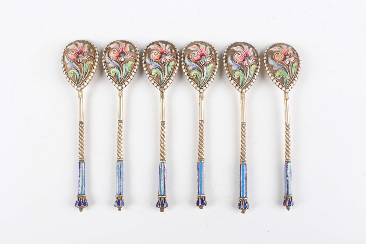 A set of six early 20th century Russian silver gilt and cloisonné enamel spoons, 84 zolotnik, each fig shaped bowl back and handle decorated with polychrome enamels, Moscow by Nicholai Alexeyev, total weight 88.8g, within an oak case.