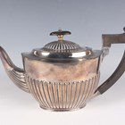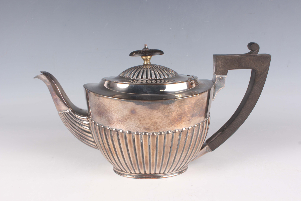 A late Victorian silver teapot of oval half-reeded form, London 1895 by Charles Stuart Harris, weight 493g, height 14cm.