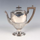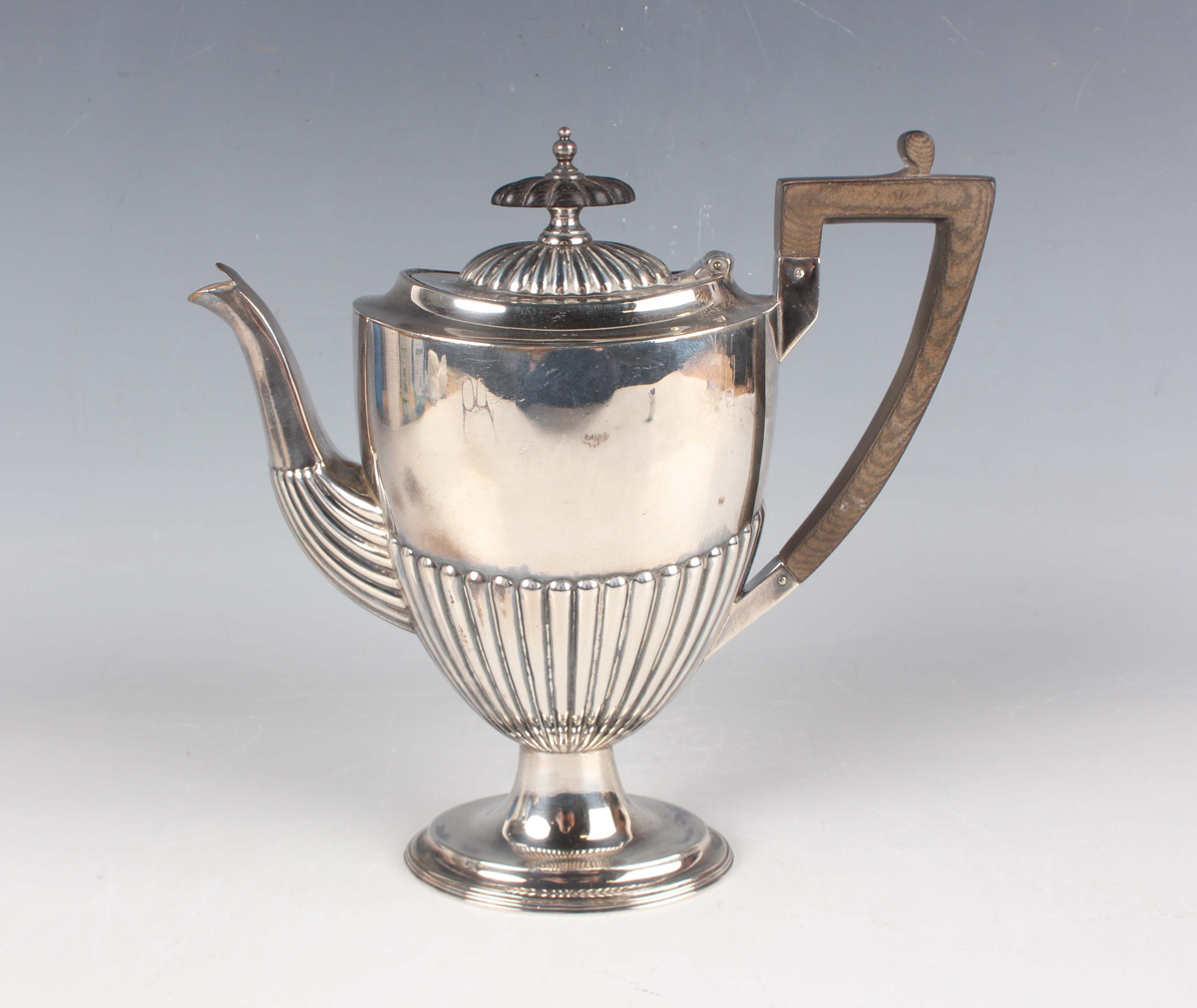 A late Victorian silver hot water pot of ovoid half-reeded form, on an oval reeded foot, Sheffield 1896 by Walker & Hall, weight 389g, height 19cm.
