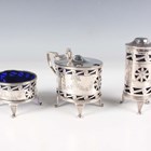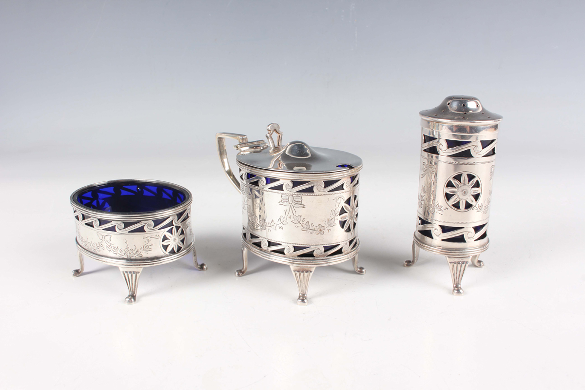 An Edwardian silver three-piece condiment set of oval form, engraved with floral garlands between pierced scroll borders and reeded rims, on tapering reeded feet, comprising mustard, salt and pepper caster, Sheffield 1903 by Walker & Hall, total weight 187.3g.