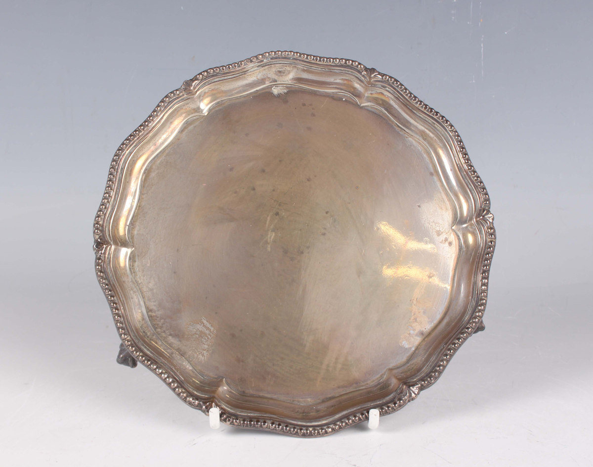 A late Victorian silver circular card salver with beaded rim, on claw and ball feet, London 1899 by Henry Stratford Ltd, weight 203.9g, diameter 15cm.