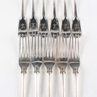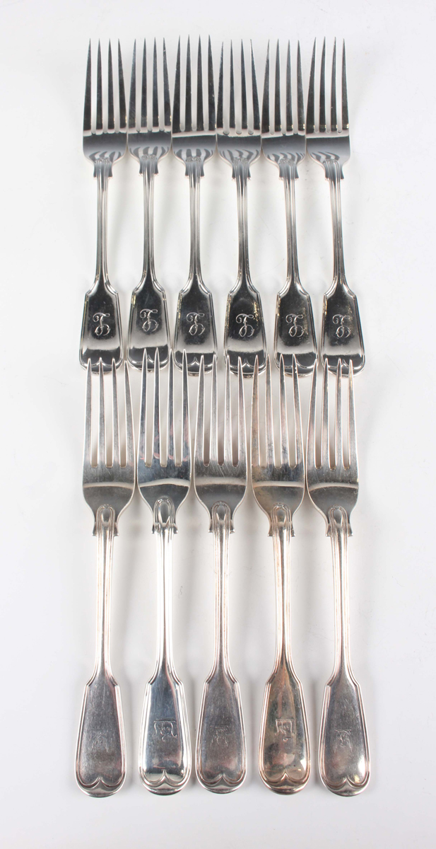 A matched set of eleven Victorian and later silver Fiddle and Thread pattern table forks, London 1842, 1850 and 1866 by George Adams, and Sheffield 1895 and 1901 by John Round & Son Ltd, total weight 977g.