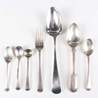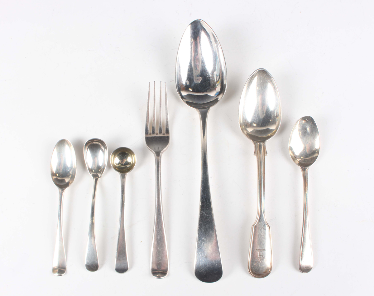 A small group of silver cutlery, including an Old English pattern tablespoon, London 1822 by William Bateman I, a Fiddle and Thread pattern dessert spoon, London 1852 by John James Whiting, and two condiment spoons, total weight 219.7g.