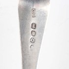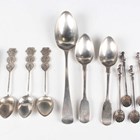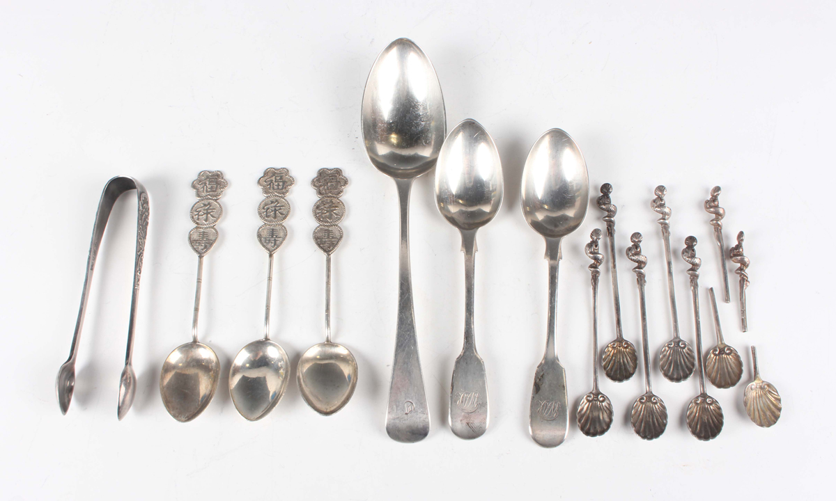 A small group of silver, comprising an Old English pattern dessert spoon, London 1811, two Fiddle pattern teaspoons, London 1851, a set of seven coffee spoons, each with a scallop shell bowl (two damaged), total weight 147g, and three Chinese silver teaspoons, each with a three-character terminal, weight 34.3g, together with a pair of plated sugar tongs.