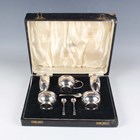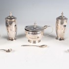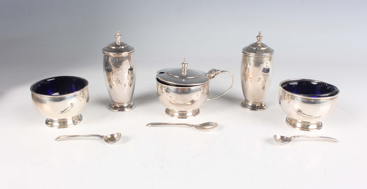 An Art Deco silver five-piece condiment set of circular form, on a circular foot, comprising two salts, mustard and two pepper casters, Birmingham 1938 by Charles S. Green & Co Ltd, with two silver salt spoons and a silver mustard spoon, total weight 161.5g, cased.