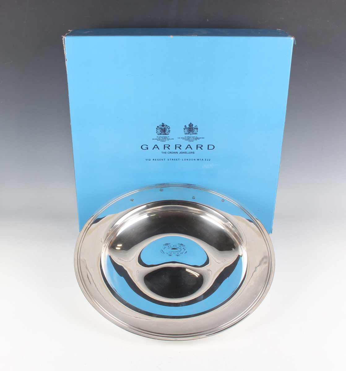 An Elizabeth II silver alms dish, London 1990 by Garrard & Co Ltd, weight 1469.9g, diameter 34.5cm, with Garrard box.
