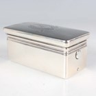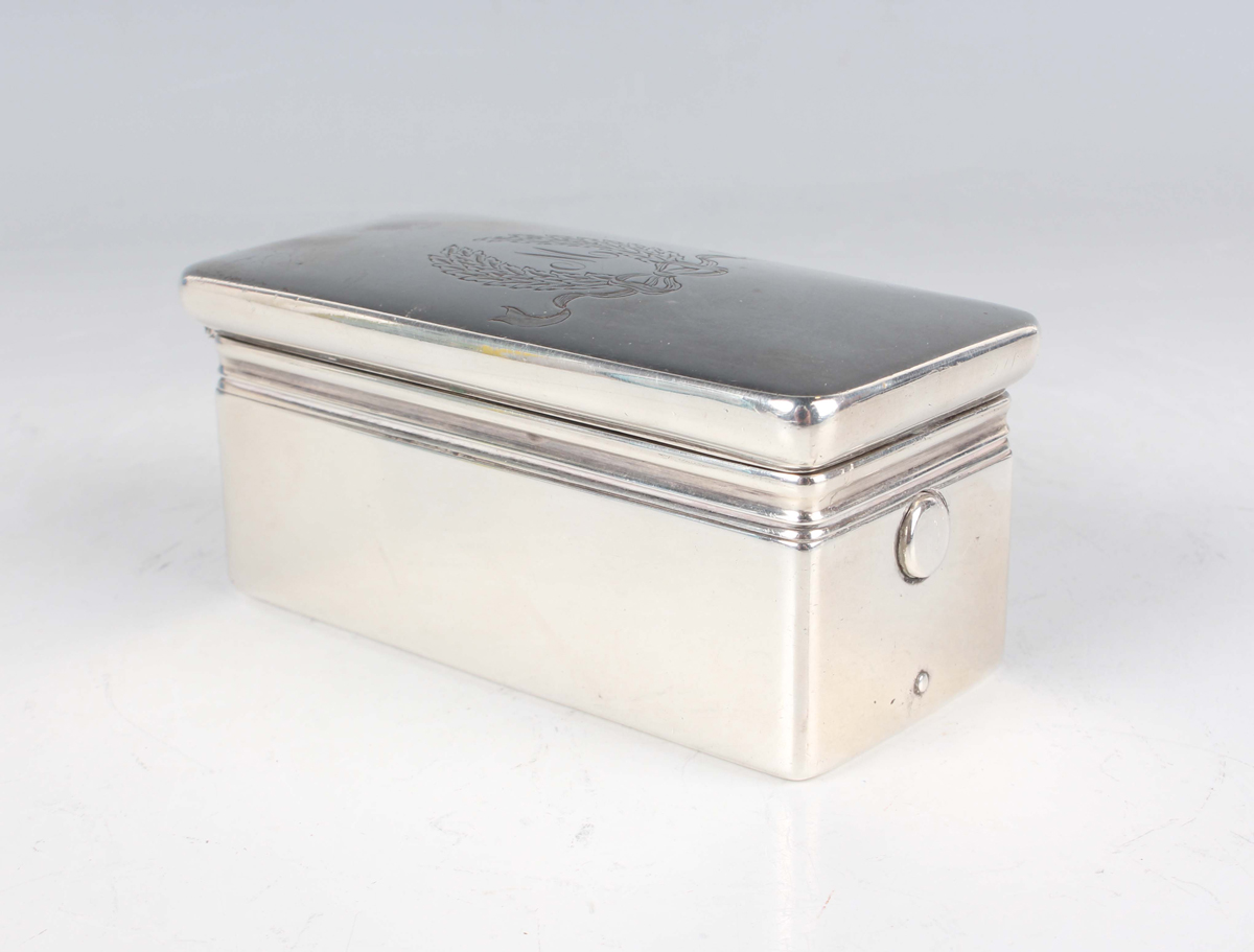 An Edwardian silver box of rectangular form with hinged lid, initial engraved within a foliate wreath and ribbon surround, the lid interior lined in cork, London 1908 by G.H. James & Co, weight 172.4g, length 9.5cm, fitted with a clear glass liner.
