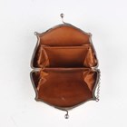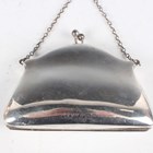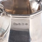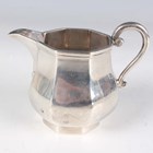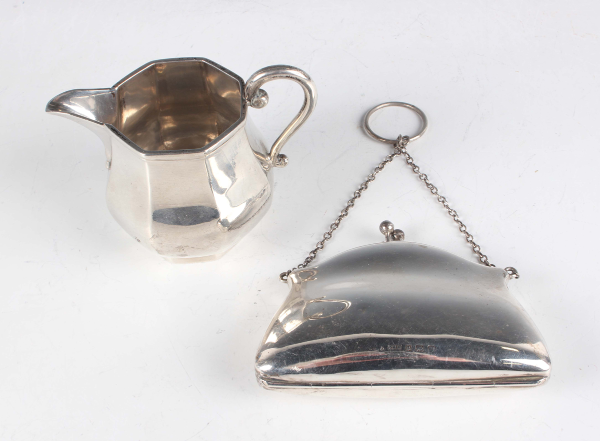 A George V silver cream jug of octagonal squat baluster form with scroll handle, Birmingham 1929 by Carrington & Co, weight 119.4g, height 7.7cm, and a silver purse with fitted tan leather interior and carrying chain, Birmingham 1919 by T.H. Hazlewood & Co, width 9.8cm, total length 16.5cm.