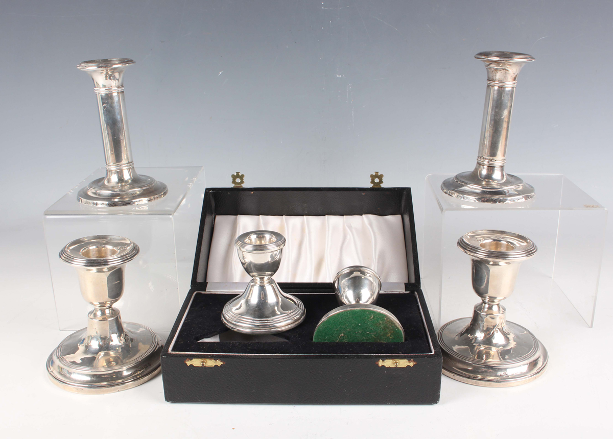 A pair of George V silver stub candlesticks with reeded bands, Birmingham 1915, height 9.4cm (faults), a pair of similar smaller silver stub candlesticks, Birmingham 1990, height 6.2cm, cased, and a pair of silver candlesticks, each with reeded sconce above a cylindrical stem, on a circular base, Birmingham 1908, height 11.3cm (faults).