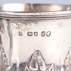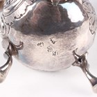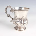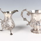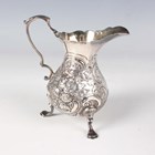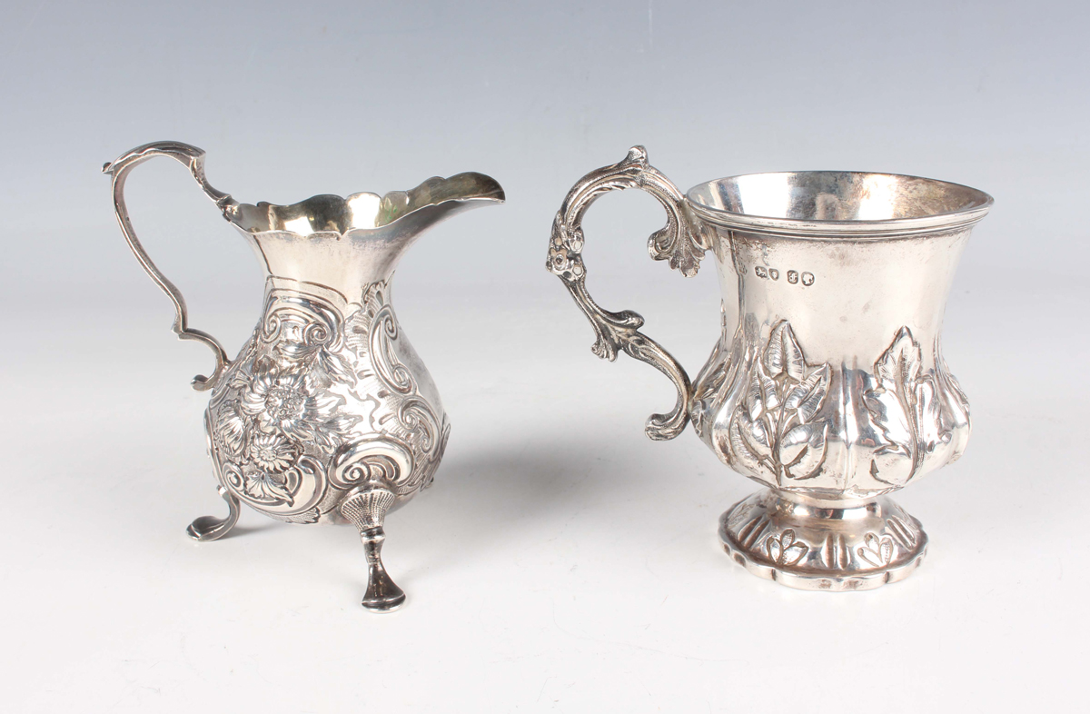 An early Victorian silver christening mug of baluster form, chased and engraved with a band of stiff leaves, flanked by a foliate scroll handle, on a similarly decorated circular foot, London 1841 by John & Henry Lias, height 10cm, and a George II silver baluster cream jug, chased and engraved with flowers and 'C' scrolls, raised on scallop shell shouldered scroll legs terminating in pad feet, London 1751 by TS, height 10.5cm, total weight 220.9g.