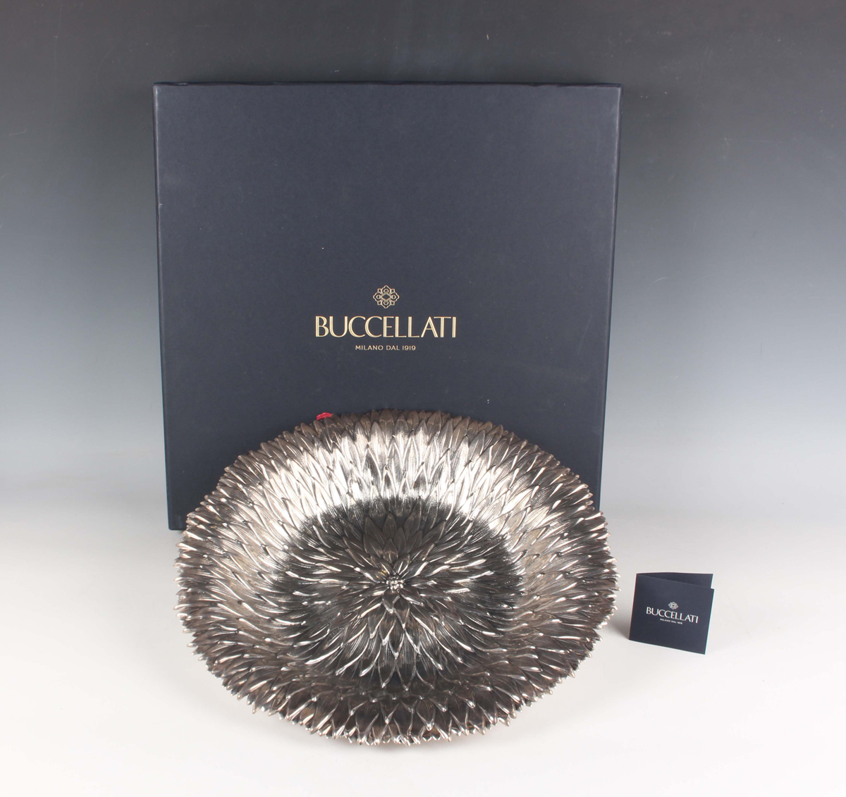 A Buccellati .925 sterling flower dish in the form of a chrysanthemum, decorated in relief with overlapping petals, stamped 'Buccellati Italy Sterling', weight 806.8g, diameter 34.2cm, with certificate and box.