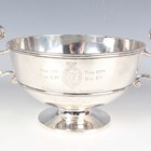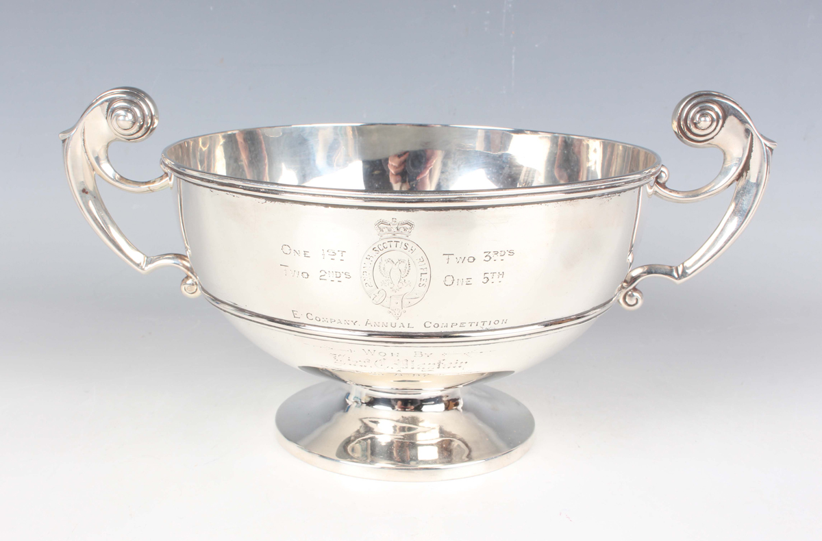 A late Victorian silver trophy cup, the circular girdled body engraved with a crown and garter crest, detailed '2nd VB Scottish Rifles' above an inscription 'E Company Annual Competition Won by...', flanked by scroll handles, on a circular foot, Chester 1896 by George Nathan & Ridley Hayes, the underside detailed 'Sharman D. Neill Belfast', weight 364.2g, height 12.5cm.