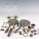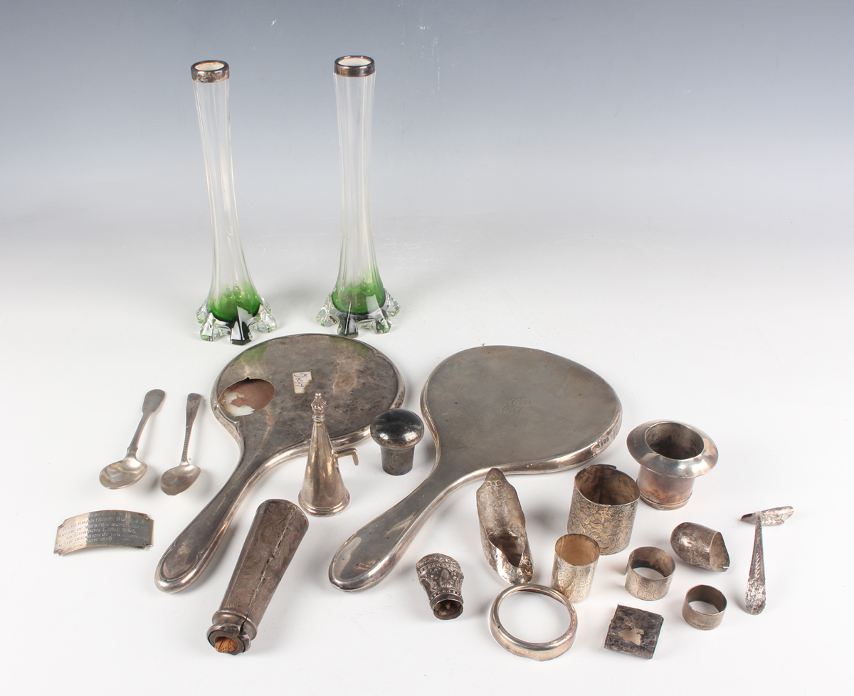 A pair of silver mounted green tinted glass specimen vases, height 20.5cm, and a small group of other silver and silver mounts, including a chamberstick snuffer and a parasol handle, weighable items 137.4g.