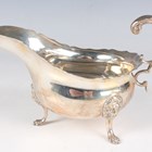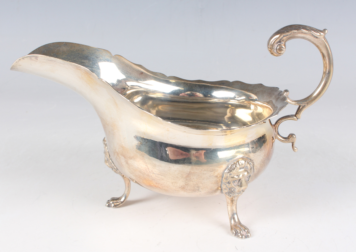 A George V silver sauceboat with foliate-capped flying scroll handle, raised on lion mask shouldered scroll legs terminating in paw feet, Chester 1913 by Haseler Brothers, weight 166.6g, height 9.7cm.