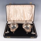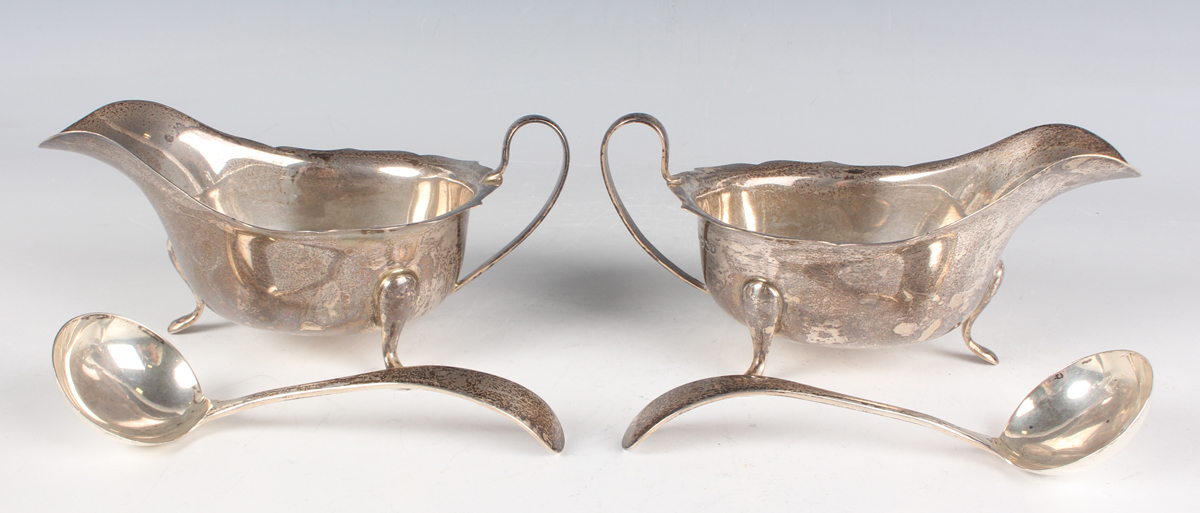 A pair of George VI silver sauceboats, each with a shaped rim, on scroll legs, with a pair of Old English pattern sauce ladles, Sheffield 1939 by Viner's Ltd, total weight 273.3g, cased.