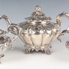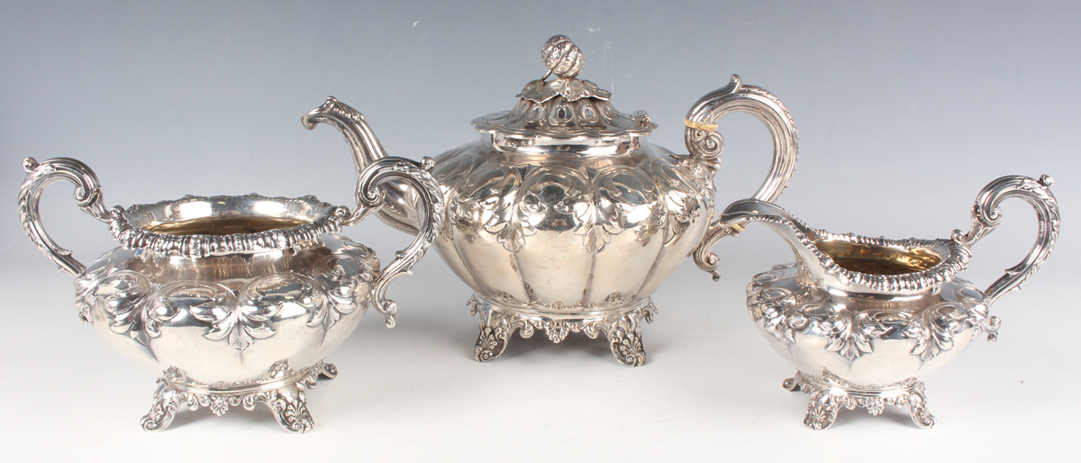 A William IV and later matched silver three-piece tea set of squat circular form, chased with acanthus leaves, on scallop shell and scroll feet, comprising teapot with fruit finial, two-handled sugar bowl and milk jug, London 1835 by Charles Reily & George Storer and London 1845 by Joseph & Albert Savory, total weight 1399.7g, height of teapot 18cm. Note: a non-transferrable ivory exemption certificate has been granted for the sale of this item.