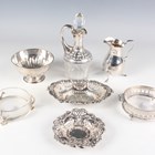 A late Victorian silver circular half-reeded sugar bowl on a stepped circular foot, London 1900 by Elkington & Co Ltd, height 5.6cm, a silver cream jug of baluster form with scroll handle, on scroll legs, Chester 1901 by Jay, Richard Attenborough & Co, height 10.5cm, two silver bonbon dishes, each with pierced and embossed decoration, two silver butter dishes, each with a glass liner, and a silver mounted cruet jug and stopper, height 17cm, weighable items 339.6g.