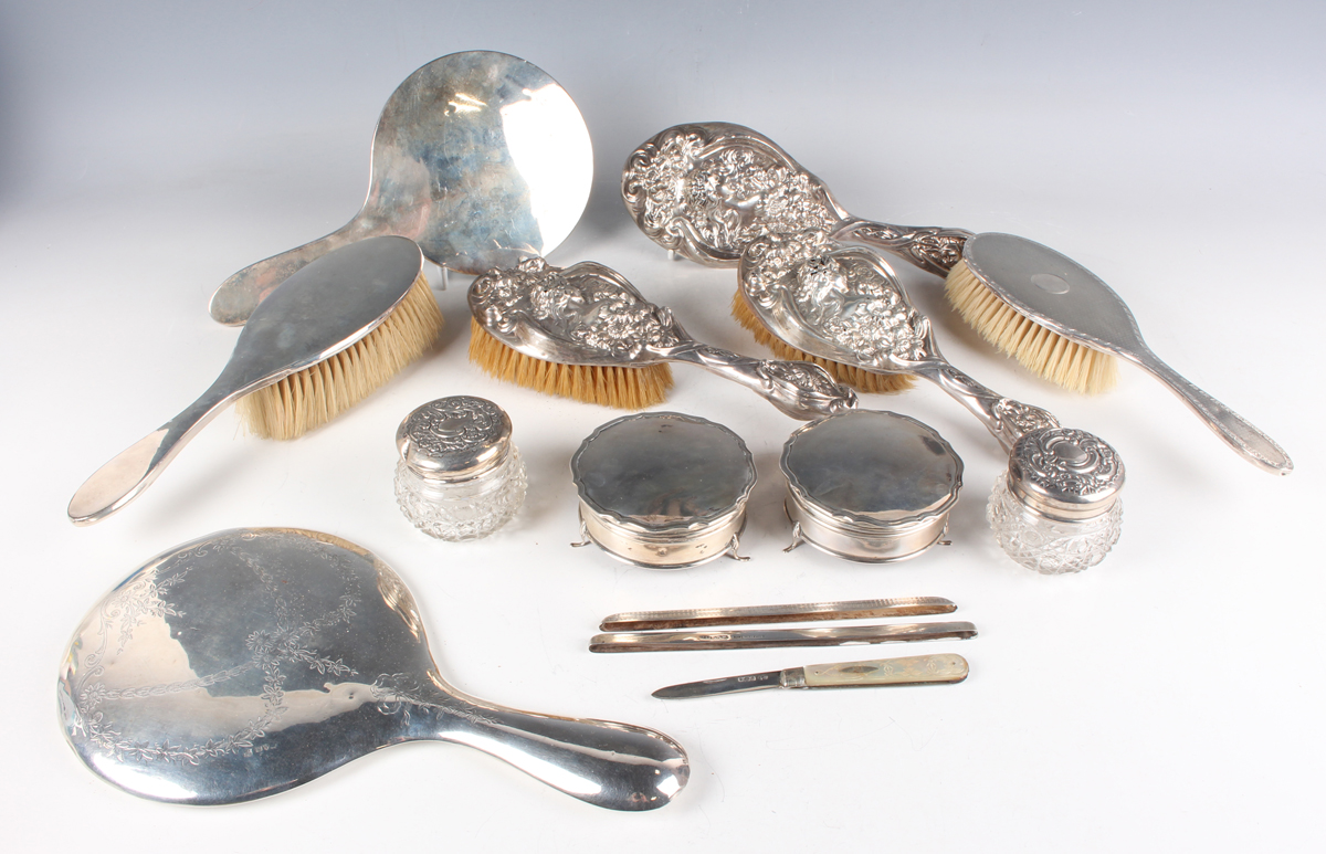 A pair of George V silver trinket boxes, each of circular form with hinged lid, on scroll feet and with fitted interior, Birmingham 1931 by Mappin & Webb Ltd, diameter 9cm, a group of silver mounted dressing table items, comprising three hand mirrors, four hairbrushes and two comb mounts, various dates and makers, a pair of silver lidded cut glass jars, Birmingham 1901 and 1903, and a silver and mother-of-pearl folding fruit knife, weighable items 53.8g.