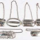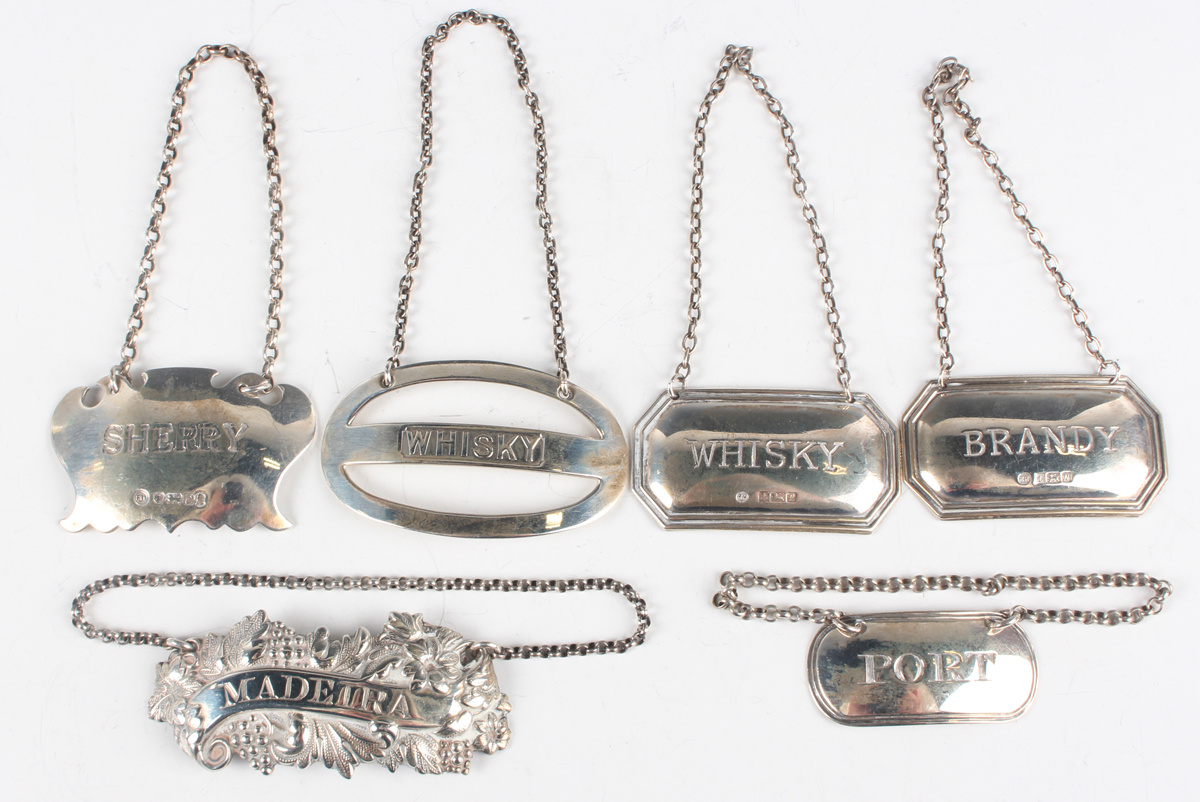 A Victorian silver 'Madeira' decanter label, decorated in relief with fruiting vines, Birmingham 1879 by John Gilbert & Co, a silver 'Whisky' decanter label, Chester 1909 by Sampson Mordan & Co Ltd, and four other silver decanter labels, comprising 'Port', 'Sherry', 'Whisky' and 'Brandy', total weight 70.8g.