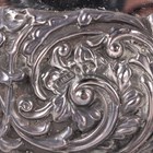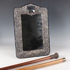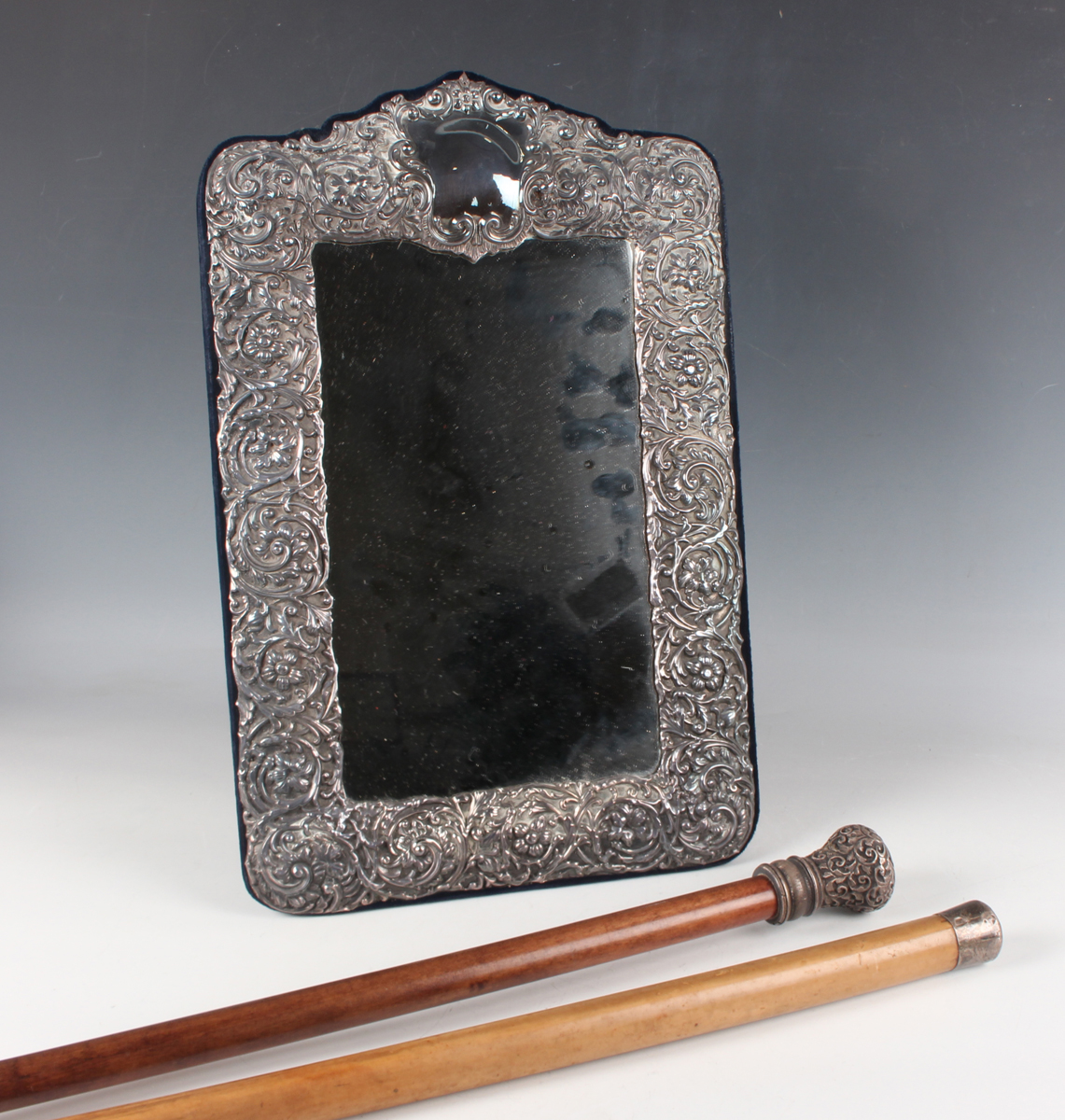 An Elizabeth II silver mounted shaped rectangular dressing table mirror, embossed with floral and foliate scroll decoration, London 1987 by M & LS, height 41cm, a silver mounted walking cane, London 1868, and an Indian silver mounted walking cane, decorated in relief with foliate scrolls, the top inset with a circular panel engraved with a bird.