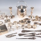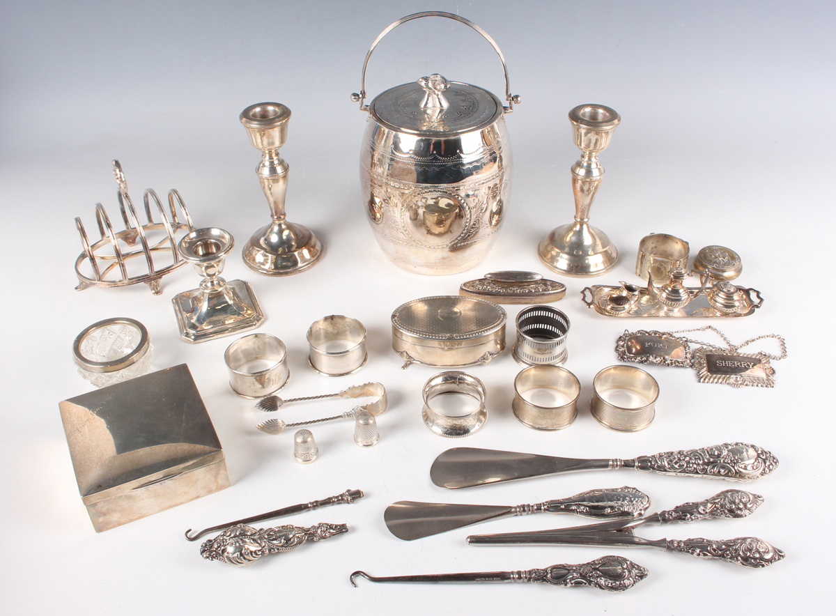 A group of silver, including a pair of baluster candlesticks, Birmingham 1977, height 13.5cm, a square cigarette box, width 9cm, five napkin rings and two thimbles, weighable items 85g, together with a small group of plated items, including a biscuit barrel, a four-division toast rack, 'Port' and 'Sherry' decanter labels and a toy five-piece tea set.
