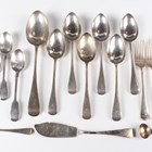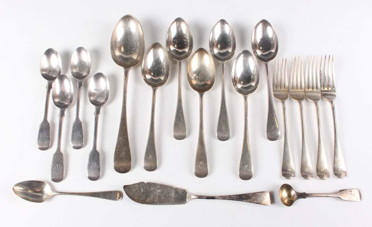 A set of six Victorian silver Old English pattern dessert spoons, a matching tablespoon and four dessert forks, London 1890 and 1891 by Robert Stebbings, and a small group of other silver cutlery, total weight 656.3g.