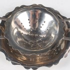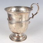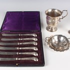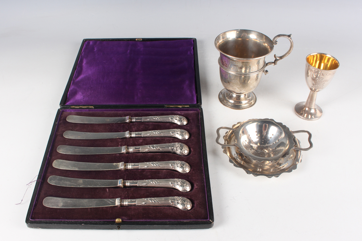An Edwardian silver christening mug of tapering cylindrical girdled form with scroll handle, on a circular foot, London 1905 by Mappin & Webb Ltd, height 11cm, a silver tea strainer and stand, Birmingham 1919, and a silver commemorative egg cup, total weight 305.9g, together with a set of six silver pistol-handled butter knives with steel blades, Sheffield 1911, cased.