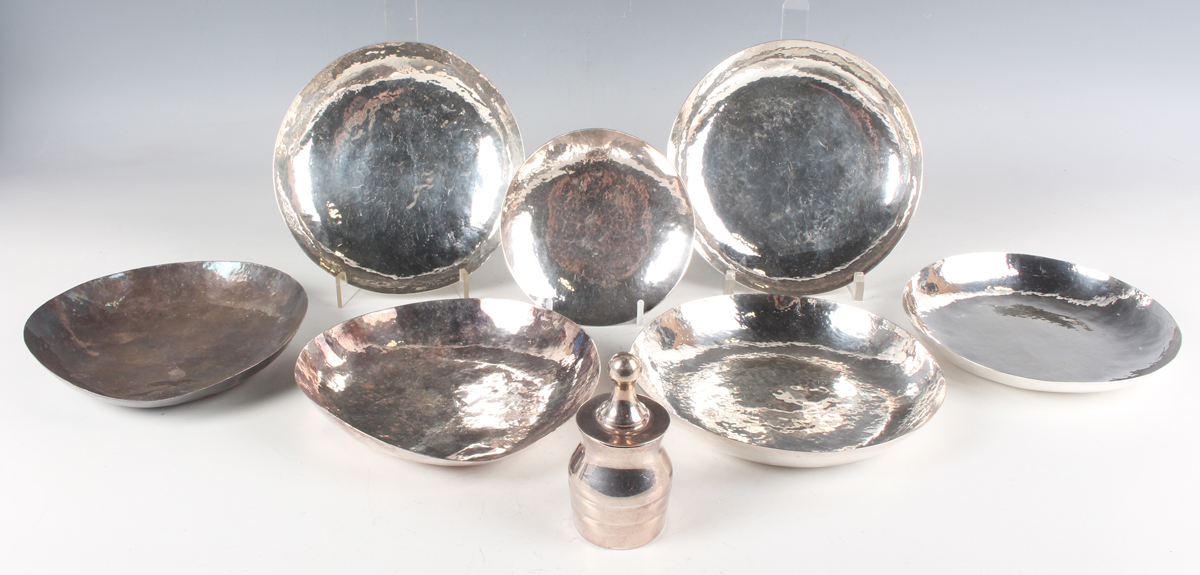 A set of six mid-20th century Zambian silver dessert bowls, diameter 15cm, a matching smaller bowl on hemispherical feet, diameter 11cm, all with hammered decoration, and a Zambian silver pot and cover, all detailed 'J.T.' to bases, total weight 958.8g.