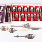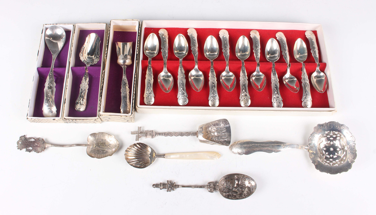 A set of twelve 20th century Dutch silver coffee spoons, each shaped handle with engraved decoration, total weight 115.8g, boxed, together with similar sugar sifter, a sugar shovel and two other spoons, weight 74.5g, two Dutch souvenir spoons, a silver and mother-of-pearl handled caddy spoon, Birmingham 1813 by JL, length 12.2cm, and a plated spoon.