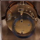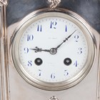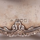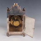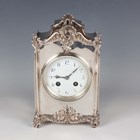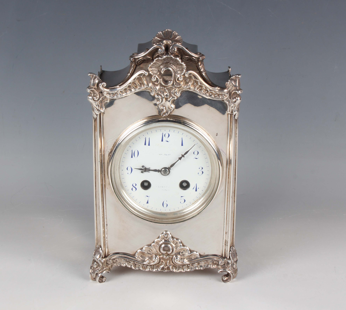 An Edwardian silver cased mantel clock with eight day movement striking on a gong, the white enamelled dial with blue Arabic hour numerals, the case with scalloped and rococo scroll surmount, with hinged back door and further rococo scrolls to base and feet, London 1902 by William Comyns, height 24.4cm, with winding key.