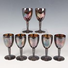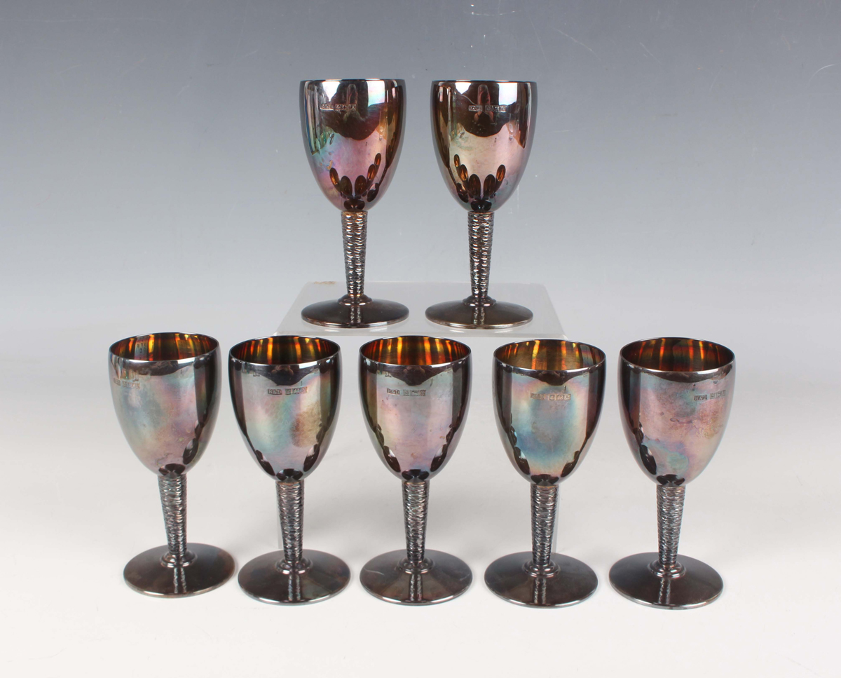 A set of seven Elizabeth II silver diminutive goblets, each ovoid bowl on a textured stem and circular foot, Birmingham 1972 by Roberts & Dore Ltd, total weight 447.8g.