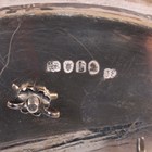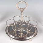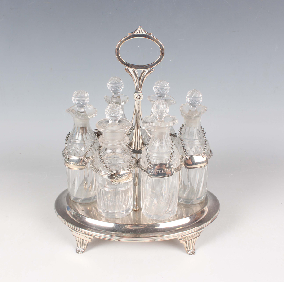 A George III silver six-bottle cruet stand of oval form with central handle and scroll feet, fitted with six cut glass bottles, London 1801 by John Emes, weight of frame 299.8g, together with a set of three silver labels, inscribed 'Kyan', 'Soy' and 'Tarragon', by Thomas Phipps & Edward Robinson, another silver label, total weight 12.4g, and two plated labels.
